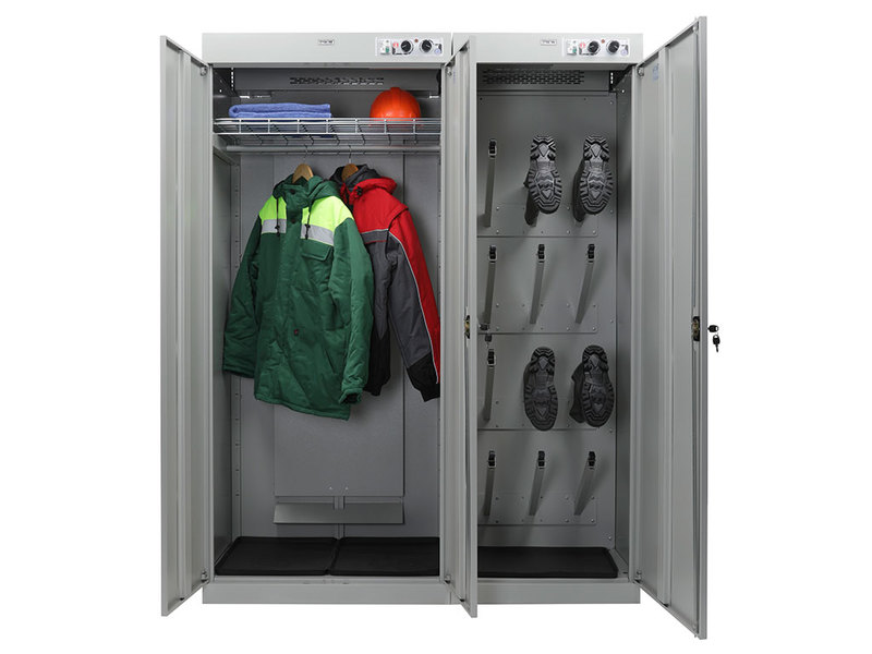 - шкаф состоит из двух независимых секций. Первая двухдверная для одежды, с перекладиной для вешалок и полкой. Вторая - для сушки обуви, оборудована патрубками для развешивания